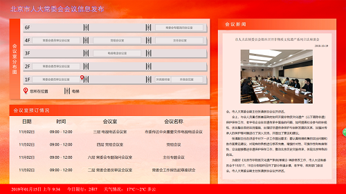 2019年1月11日,“北京市人民代表大会常务委员会”在通州副中心正式揭牌,慧峰科技提供的“智慧楼宇数字媒体信息发布”系统运行平稳。这是继港珠澳大桥项目之后,慧峰公司参与的又一“国”字号工程。