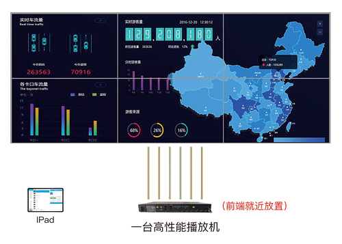 系统建设成本低:设备数量少,就一台高性能播放机,易安装易维护,通过数字化系统进行软拼接。