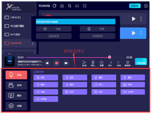 系统控制区为对当前选中的显示端进行系统的控制,系统控制有四个按钮,分别为:系统音量,手动播放,自动播放,停止播放。