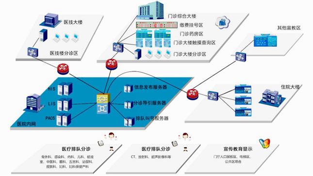 系统由服务器(服务器硬件+服务器端管理软件)+媒体播放机(媒体播放机硬件+播放机软件)+液晶电视机+遥控器+红外控制器+服务中心管理构成。 借助医院的有线/无线局域网、广域网、互联网等,应用于门诊楼、住院楼、综合楼的各候诊区、收费区、取药处、各个大楼大厅门口、电梯口、病房等公共区域。