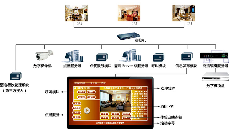 酒店现在具备的功能设施越来越丰富,包含餐饮、住宿、会展、庆典活动、会议、健身、环境体验等等,而酒店功能区包括大堂、购物商场、休息等候区、豪华包厢、会议厅、宴请厅、健身厅等等,而“信息交互与发布系统”的目的,就是让顾客从进入酒店的那一刻起,就可以享受到完美的信息化服务,并带给顾客智能、便捷、高档次的享受与体验。根据宾馆酒店实际应用情况,我们建议在大堂、会议室门口、电梯间、贵宾厅、包房等区域进行液晶信息展示和指示。